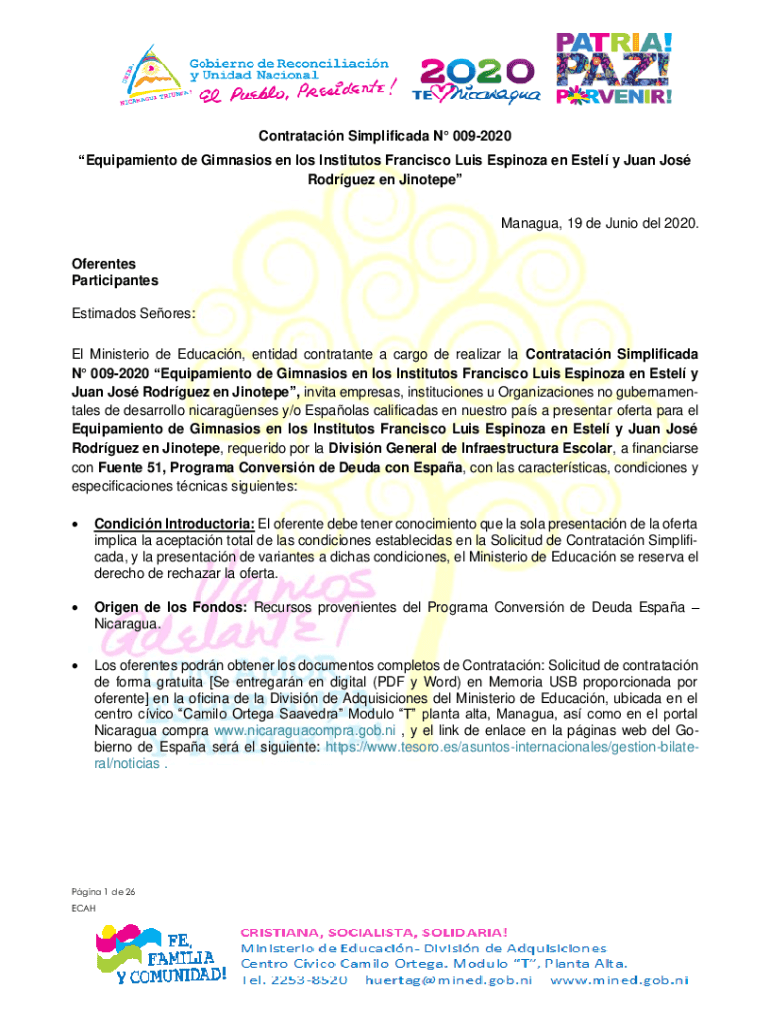 Contratacin Simplified N 0092020 Equipment de Gimnasios en Los Institutes Francisco Luis Espinoza en Ester y Juan Jo's Rodriguez en Linotype Managua, 19 de Junior Del 2020. Operates Participants Estimates