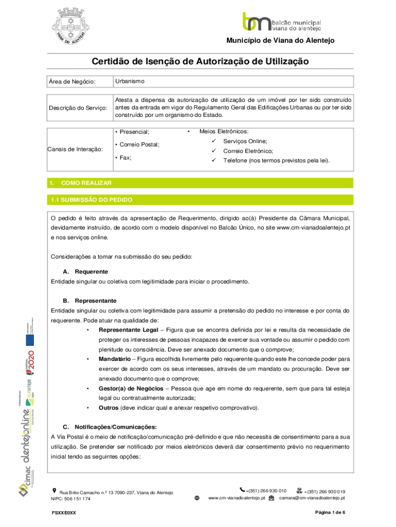 Municipal de Viana do AlentejoCertido de Iseno de Autorizao de Utilizao REA de Nuncio:UrbanismoDescrio do Sergio:Avesta a dispensed the authorized DE utilize DE um impel porter side construct antes