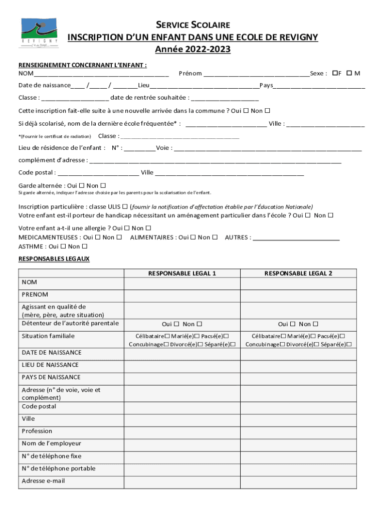 SERVICE CLAIRE INSCRIPTION DUN ENFANT DAYS ONE COLE DE REIGN Anne 20222023 REASSIGNMENT CONCERN ANT ENFANT : NOM___Prnom ___See : FM Date de Renaissance___ /___ / ___Lieu___Pays___ Class : ___ date
