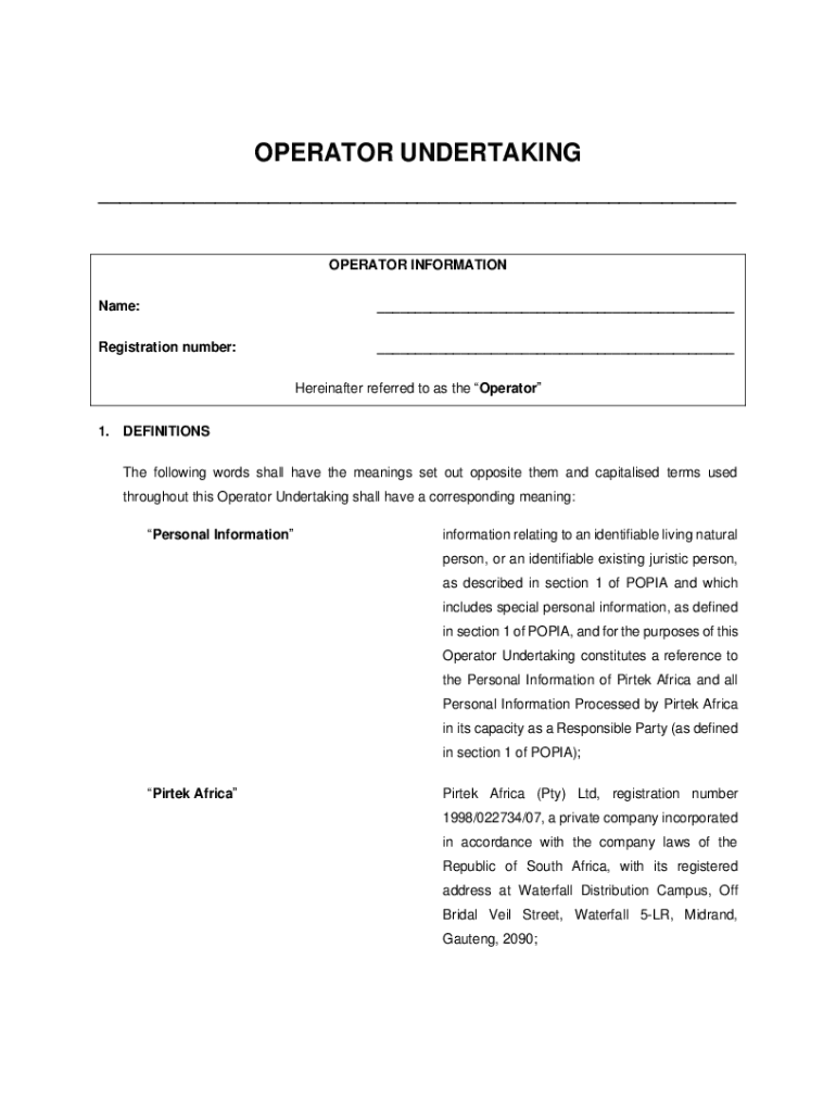 OPERATOR UNDERTAKING ___OPERATOR INFORMATION Name:___Registration number:___ Hereinafter referred to as the Operator1. DEFINITIONS The following words shall have the meanings set out opposite them