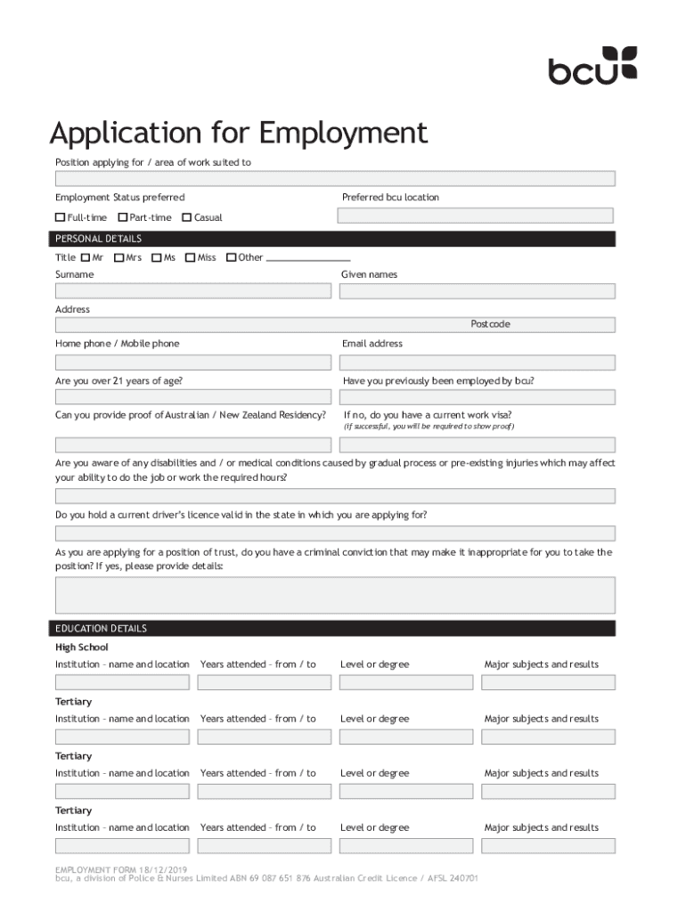 Application for Employment Position applying for / area of work suited to Employment Status preferred Full time ParttimePreferred BCU location CasualPERSONAL DETAILS Title Mr Mrs Ms Miss OtherSurnameGiven