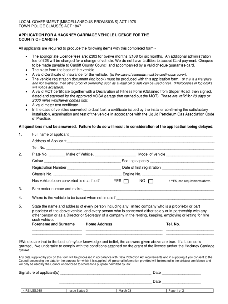 LOCAL GOVERNMENT (MISCELLANEOUS PROVISIONS) ACT 1976 TOWN POLICE CLAUSES ACT 1847 APPLICATION FOR A HACKNEY CARRIAGE VEHICLE License FOR THE COUNTY OF CARDIFF All applicants are required to produce