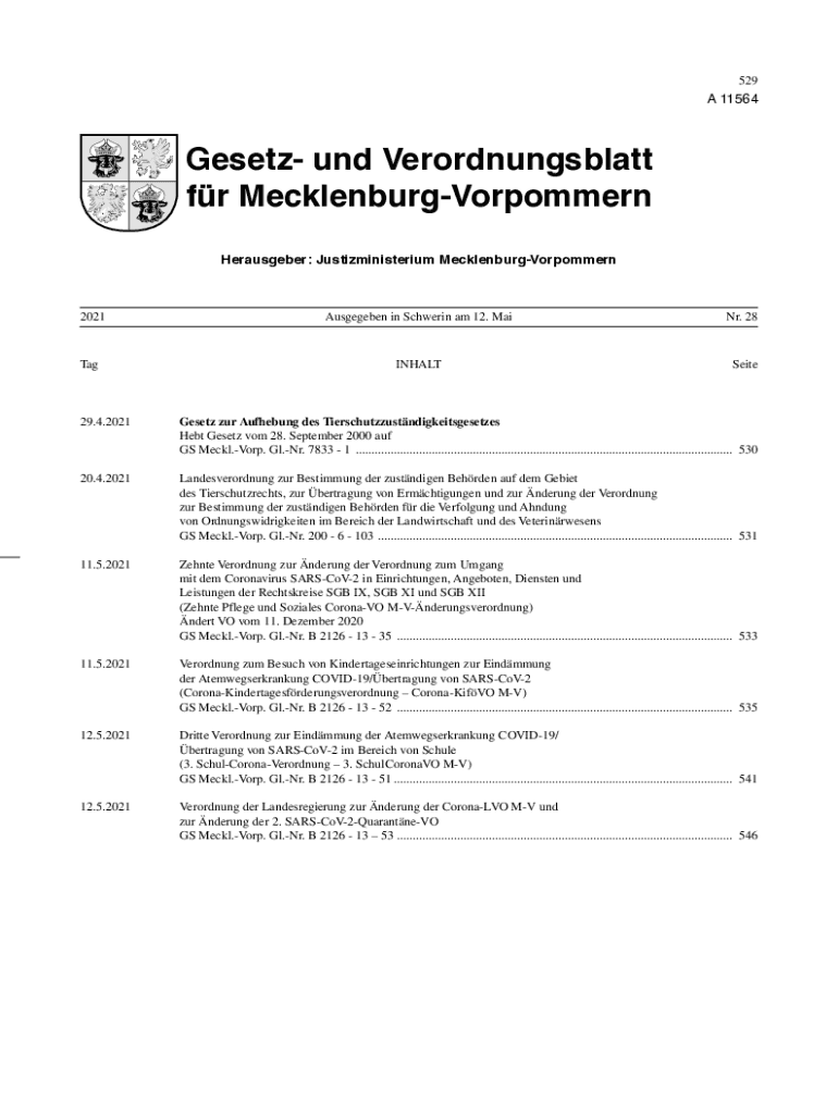 529A 11564Gesetz UND Verordnungsblatt for Mecklenburg-Vorpommern Herausgeber: Justizministerium MecklenburgVorpommern2021Ausgegeben in Schwerin am 12. Main. 28TagINHALTSeite29.4.2021Gesetz our Aufhebung