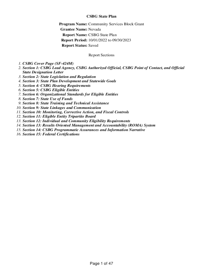 CSG State Plan Program Name: Community Services Block Grant Grantee Name: Nevada Report Name: CSG State Plan Report Period: 10/01/2022 to 09/30/2023 Report Status: Saved Report Sections 1. CSG Cover
