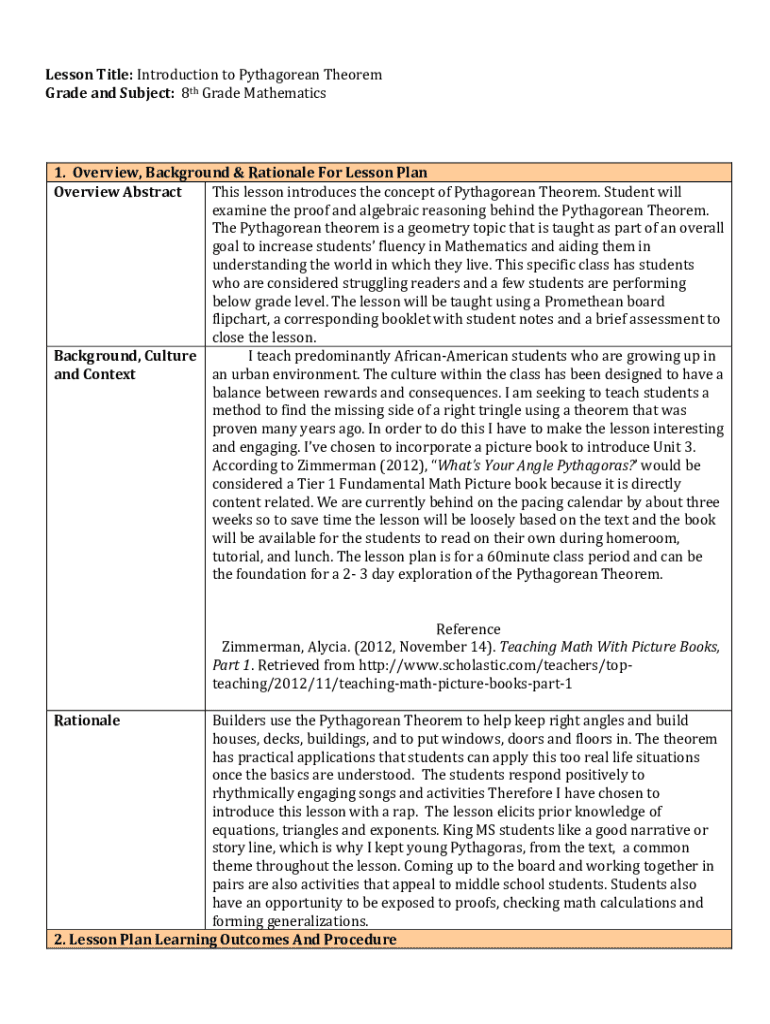 LessonTitle:IntroductiontoPythagoreanTheorem GradeandSubject: 8thGradeMathematics1. Overview, Background&RationaleForLessonPlan OverviewAbstract ThislessonintroducestheconceptofPythagoreanTheorem.