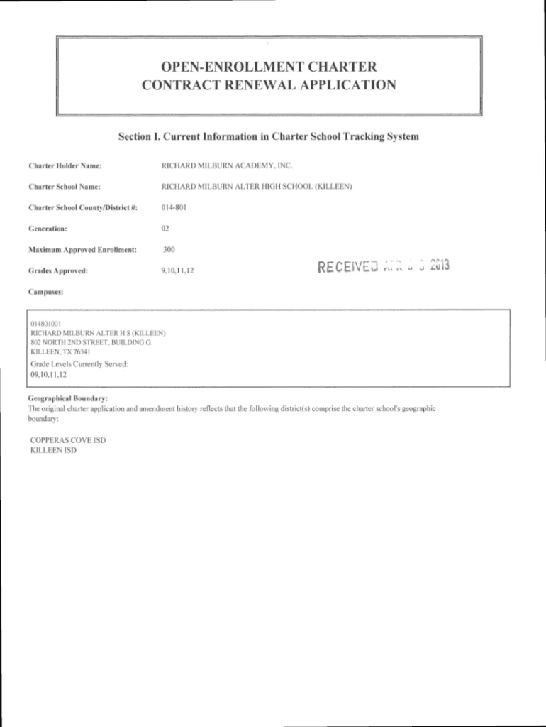 OPENENROLLMENT CHARTER CONTRACT RENEWAL APPLICATIONSection I. Current Information in Charter School Tracking System Charter Holder Name:RICHARD WILBURN ACADEMY, INC. Charter School Name:RICHARD WILBURN