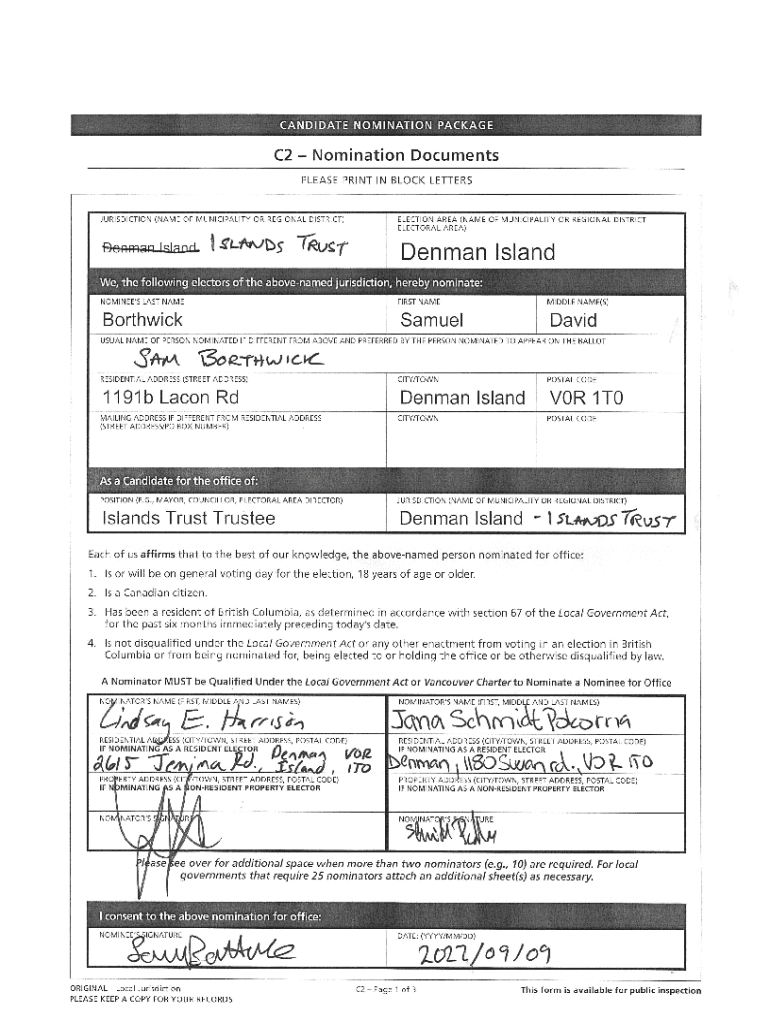 CANDIDATE NOMINATION PACKAGEC2Nomination DocumentsPLEASE PRINT IN BLOCK LETTERSJURISDICTION (NAME OF MUNICIPALITY OR REGIONAL DISTRICT)9eisIaI. I L1&t5ELECTION AREA (NAME OF MUNICIPALITY OR REGIONAL