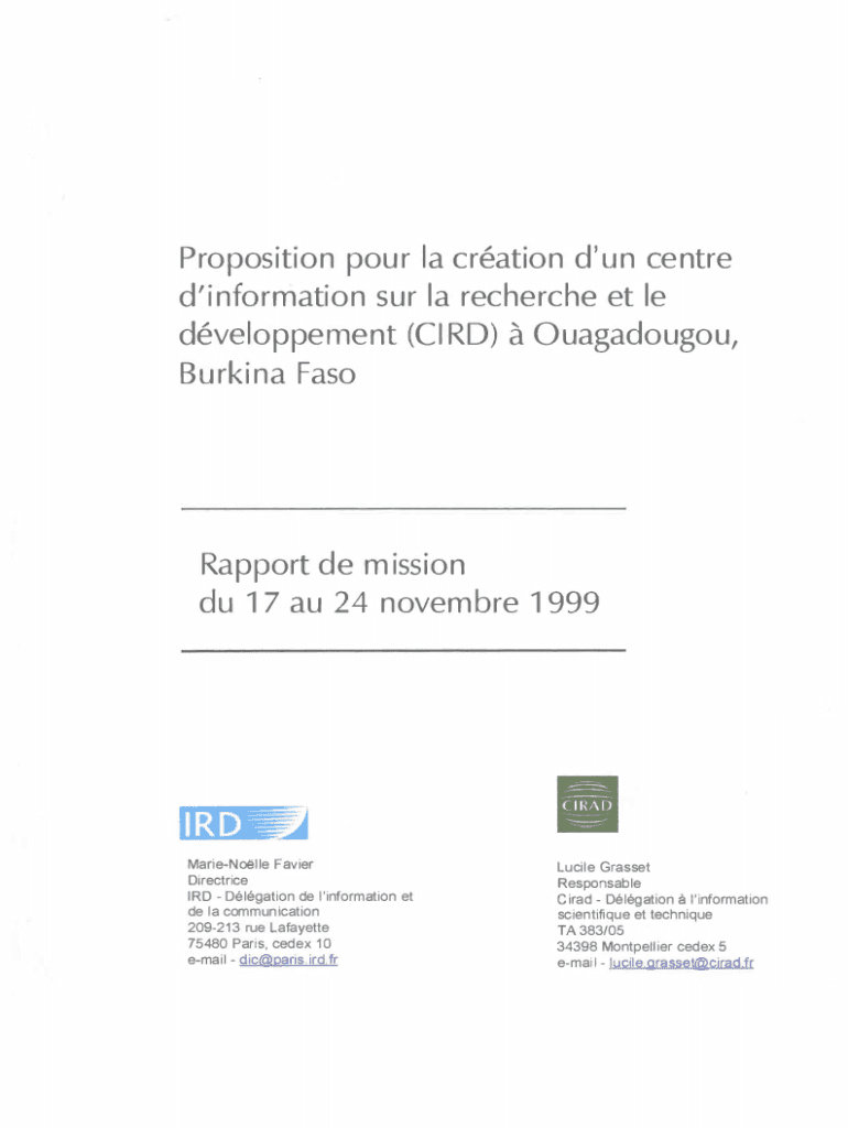 Proposition pours lac ration d\'UN center d\'information SUR la recherché et LE development (CAIRO) Ouagadougou, Burning FasoRapport de mission Du 1 7 au 24 November 1999MarieNolle Xavier Direct