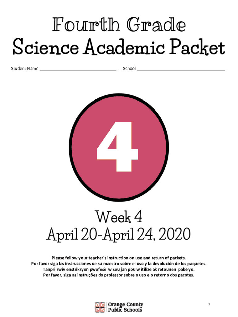 Fourth Grade Science Academic Packet Student Name ___School ___Week 4 April 20April 24, 2020 Please follow your teacher\'s instruction on use and return of packets. POR favor sign leis instructions