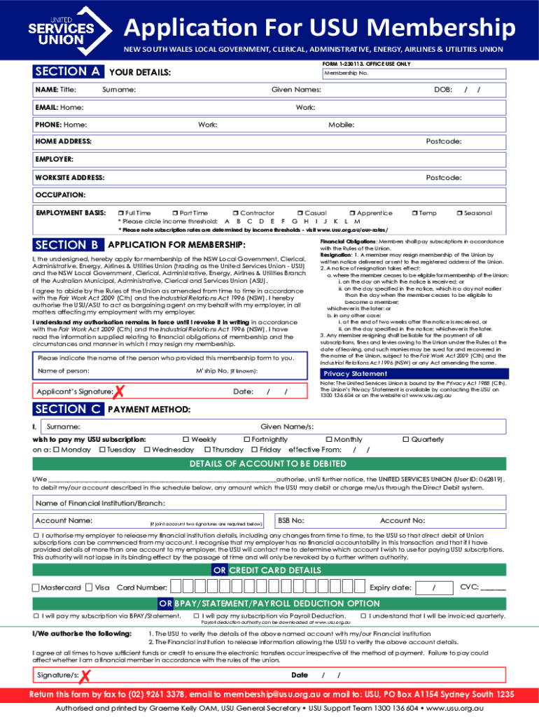 Application For USU Membership NEW SOUTH WALES LOCAL GOVERNMENT, CLERICAL, ADMINISTRATIVE, ENERGY, AIRLINES & UTILITIES UNIONIZATION A NAME: Title:FORM 1230113. OFFICE USE ONLYYOUR DETAILS:Membership
