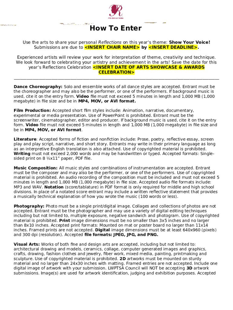 The National PTA Reflections Program Entry Form includes several key components and fillable fields essential for successful completion. Important fields such as 'INSERT CHAIR NAME' and 'INSERT DEADLINE' are included to ensure clarity in submissions. Moreover, instruction sections guide entrants on required information, and local PTAs are tasked with completing specific sections related to the submission.