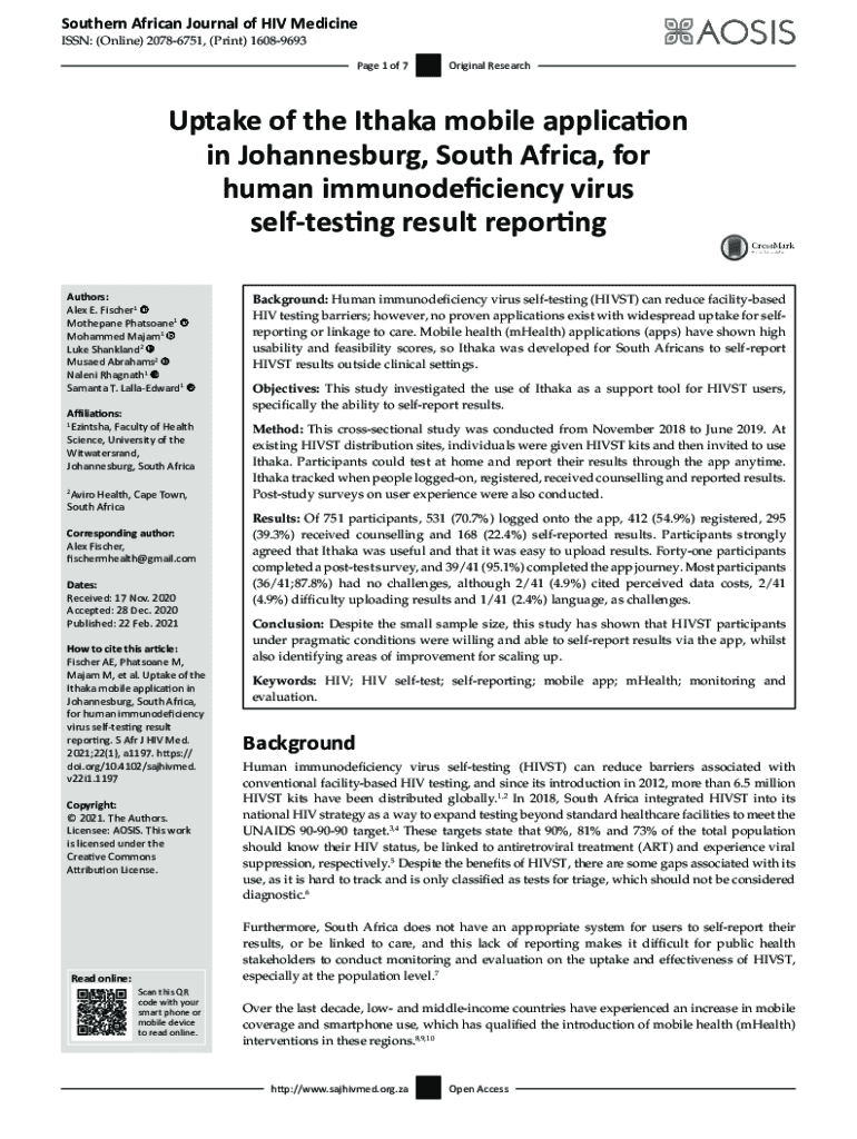 ISSN: (Online) 20786751, (Print) 16089693Page 1 of 7Original ResearchUptake of the Ithaca mobile application