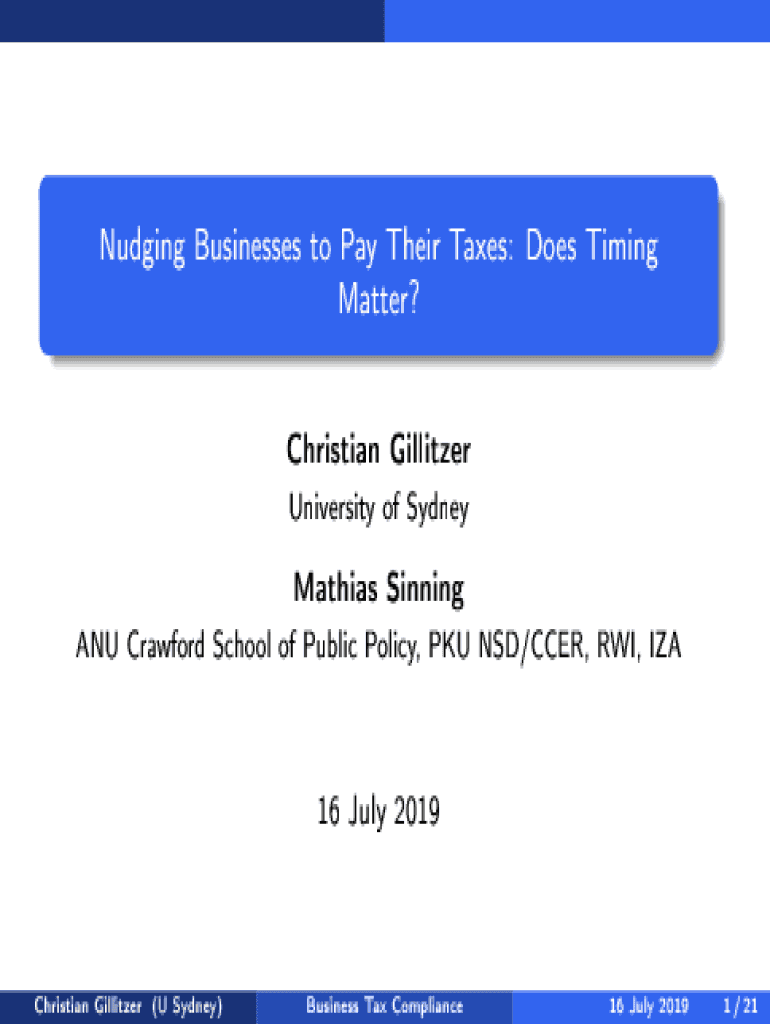 Nudging Businesses to Pay Their Taxes: Does Timing Matter? Christian Pulitzer University of Sydney Mathias Sinning Crawford School of Public Policy, PKU NSW/CCR, WWI, IZA16 July 2019Christian Pulitzer