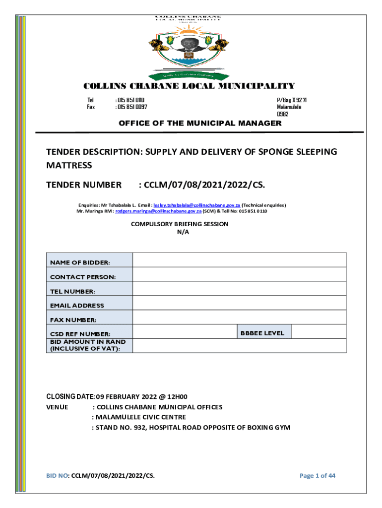 COLLINS CHARADE LOCAL MUNICIPALITY Tel Fax: 015 851 0110 : 015 851 0097P/Bag X 9271 Malamute 0982OFFICE OF THE MUNICIPAL MANAGERTENDER DESCRIPTION: SUPPLY AND DELIVERY OF SPONGE SLEEPING MATTRESS