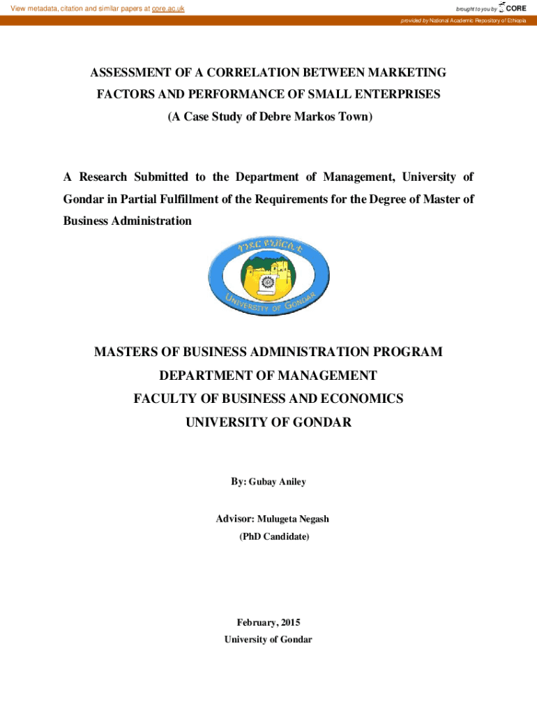 View metadata, citation and similar papers at core.ac.brought to you byCOREprovided by National Academic Repository of EthiopiaASSESSMENT OF A CORRELATION BETWEEN MARKETING FACTORS AND PERFORMANCE