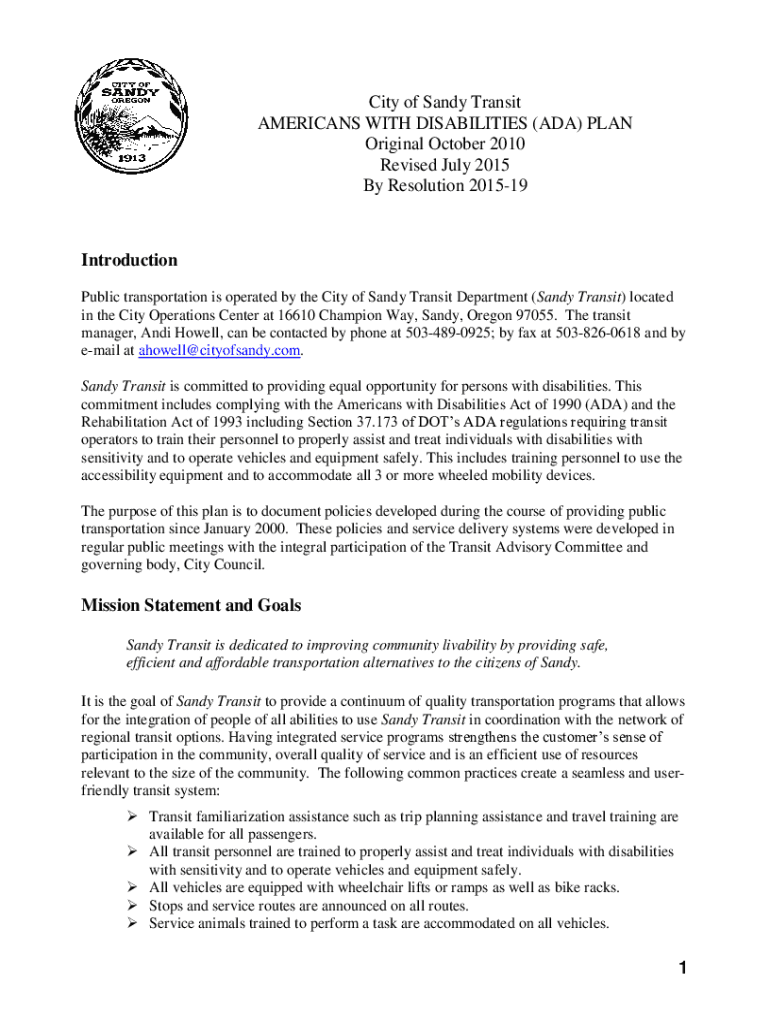 City of Sandy Transit AMERICANS WITH DISABILITIES (ADA) PLAN Original October 2010 Revised July 2015 By Resolution 201519Introduction Public transportation is operated by the City of Sandy Transit