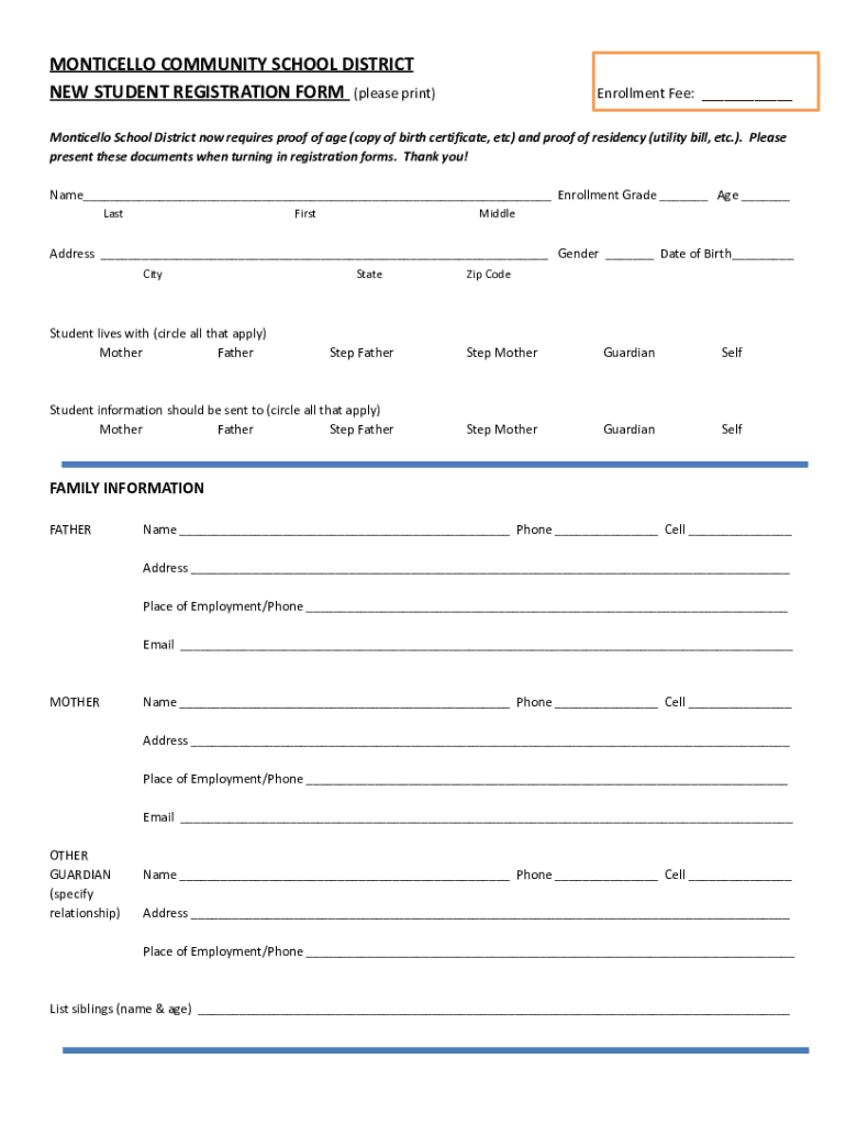 MONTICELLO COMMUNITY SCHOOL DISTRICT NEW STUDENT REGISTRATION FORM (please print)Enrollment Fee: ___Monticello School District now requires proof of age (copy of birth certificate, etc) and proof