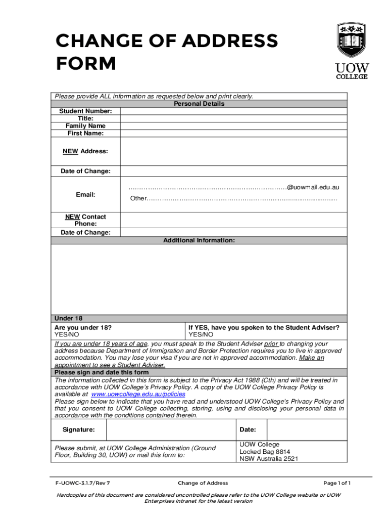 CHANGE OF ADDRESS FORM Please provide ALL information as requested below and print clearly. Personal Details Student Number: Title: Family Name First Name: NEW Address: Date of Change:. Hotmail.edu.AU