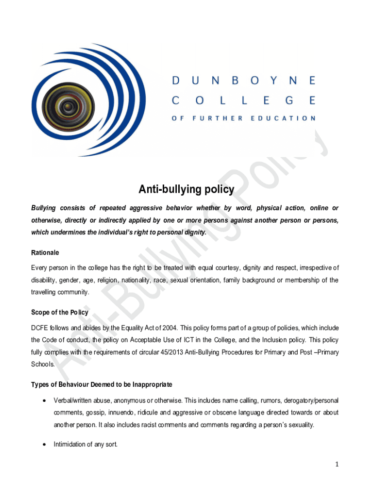 Get the free Anti-bullying policy - Dunboyne College of Further Education