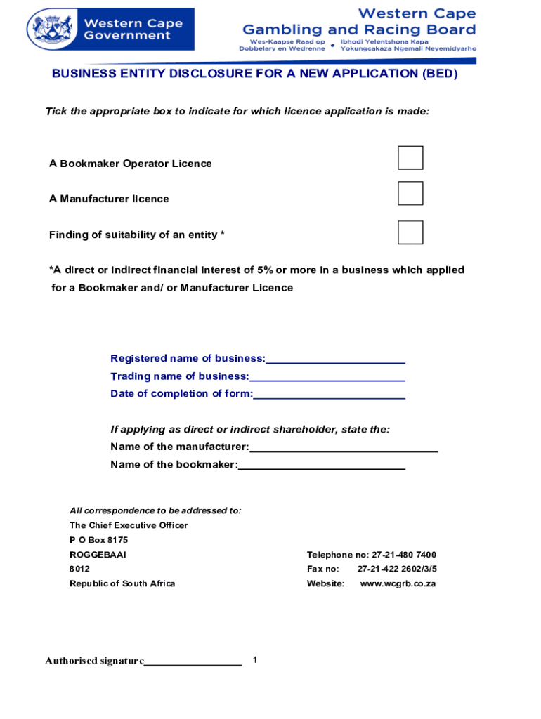 BUSINESS ENTITY DISCLOSURE FOR A NEW APPLICATION (BED) Tick the appropriate box to indicate for which license application is made:A Bookmaker Operator License A Manufacturer license Finding of suitability