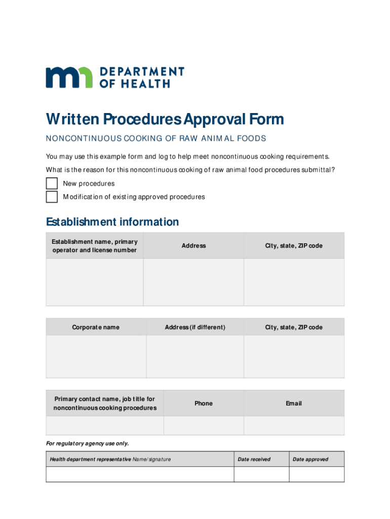 Written Procedures Approval Form NONCONTINUOUS COOKING OF RAW ANIMAL FOODS You may use this example form and log to help meet noncontinuous cooking requirements. What is the reason for this noncontinuous