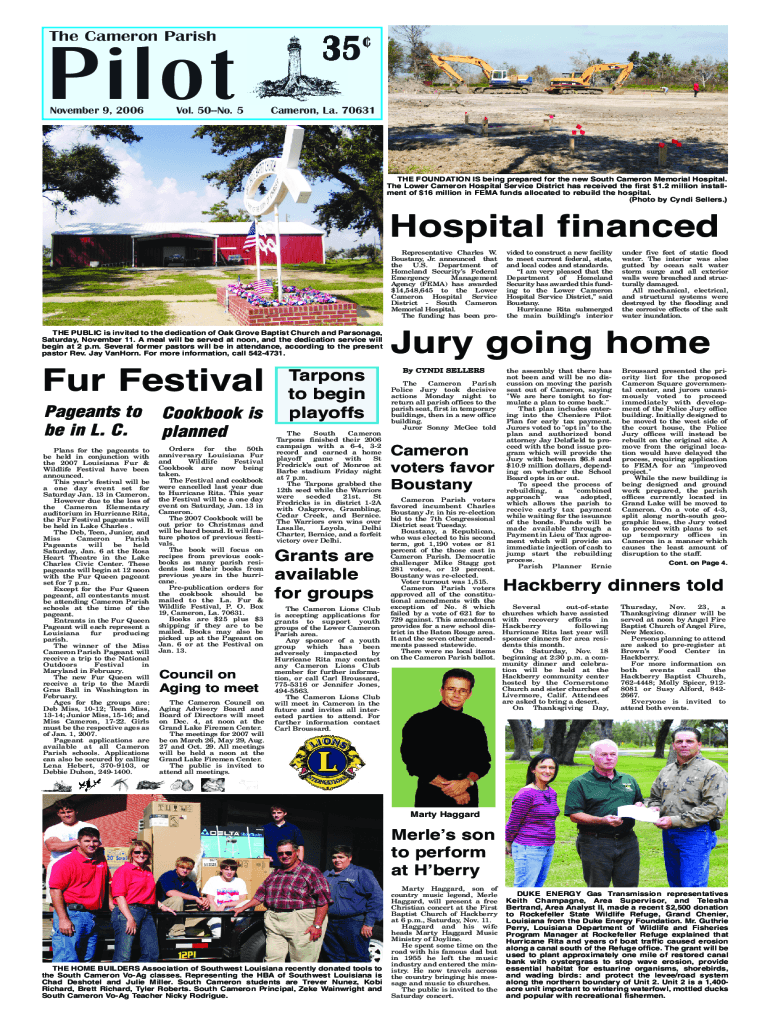 Pilot The Cameron Parish November 9, 2006Vol. 50No. 55Cameron, La. 70631THE FOUNDATION IS being prepared for the new South Cameron Memorial Hospital. The Lower Cameron Hospital Service District has