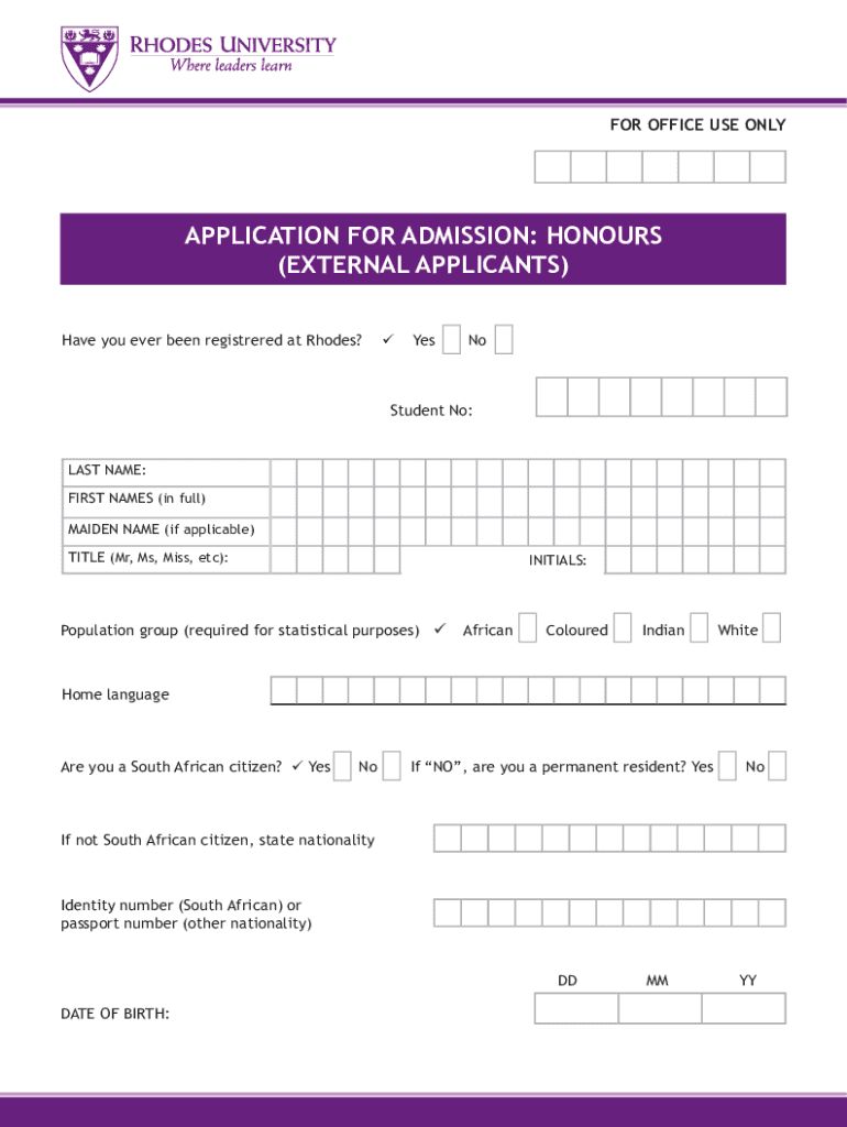 FOR OFFICE USE ONLYAPPLICATION FOR ADMISSION: Honors (EXTERNAL APPLICANTS) Have you ever been registered at Rhodes? YesNoStudent No:LAST NAME: FIRST NAMES (in full) MAIDEN NAME (if applicable) TITLE