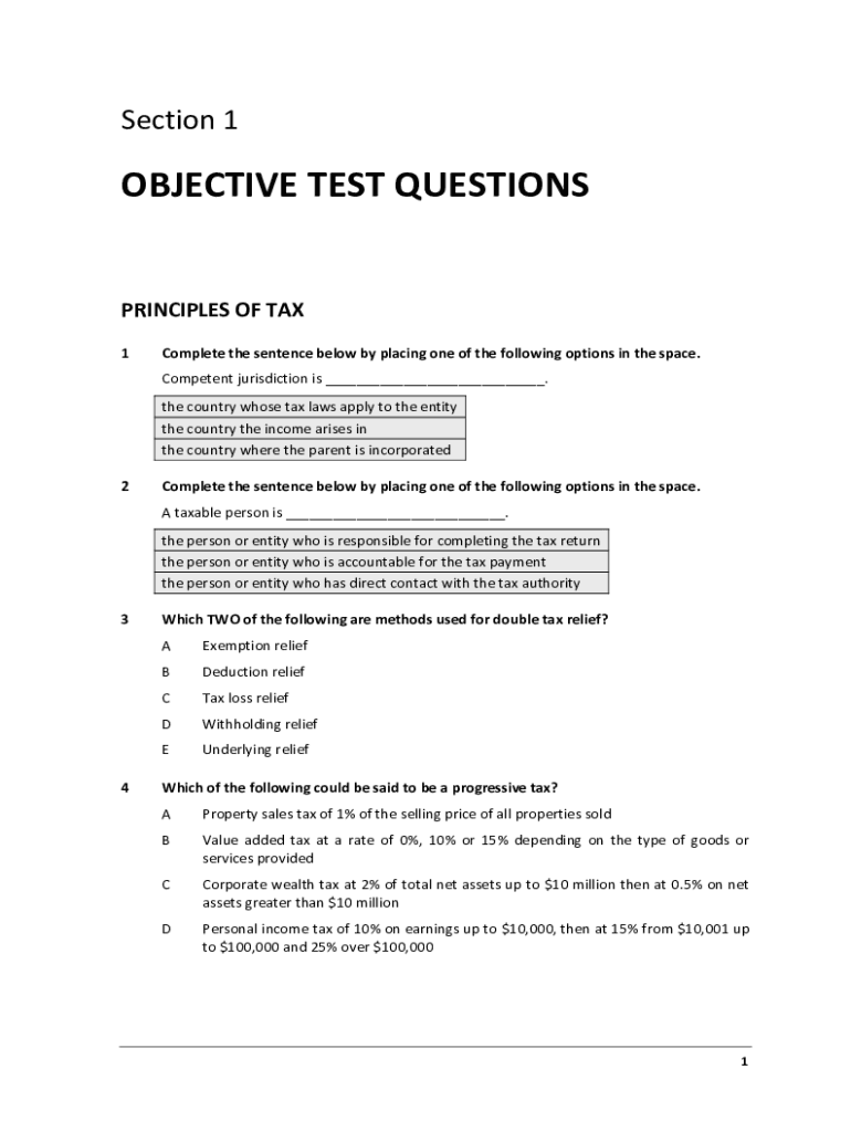 Section 1OBJECTIVE TEST QUESTIONS PRINCIPLES OF TAX 1Complete the sentence below by placing one of the following options in the space. Competent jurisdiction is ___. The country whose tax laws apply