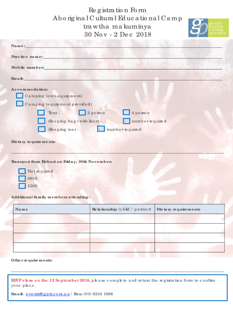 Registration Form Aboriginal Cultural Educational Camp growth alumina 30 Nov 2 Dec 2018 Name: Practice name: Mobile number: Email: Accommodation: Camping (own equipment) Camping (equipment provided)