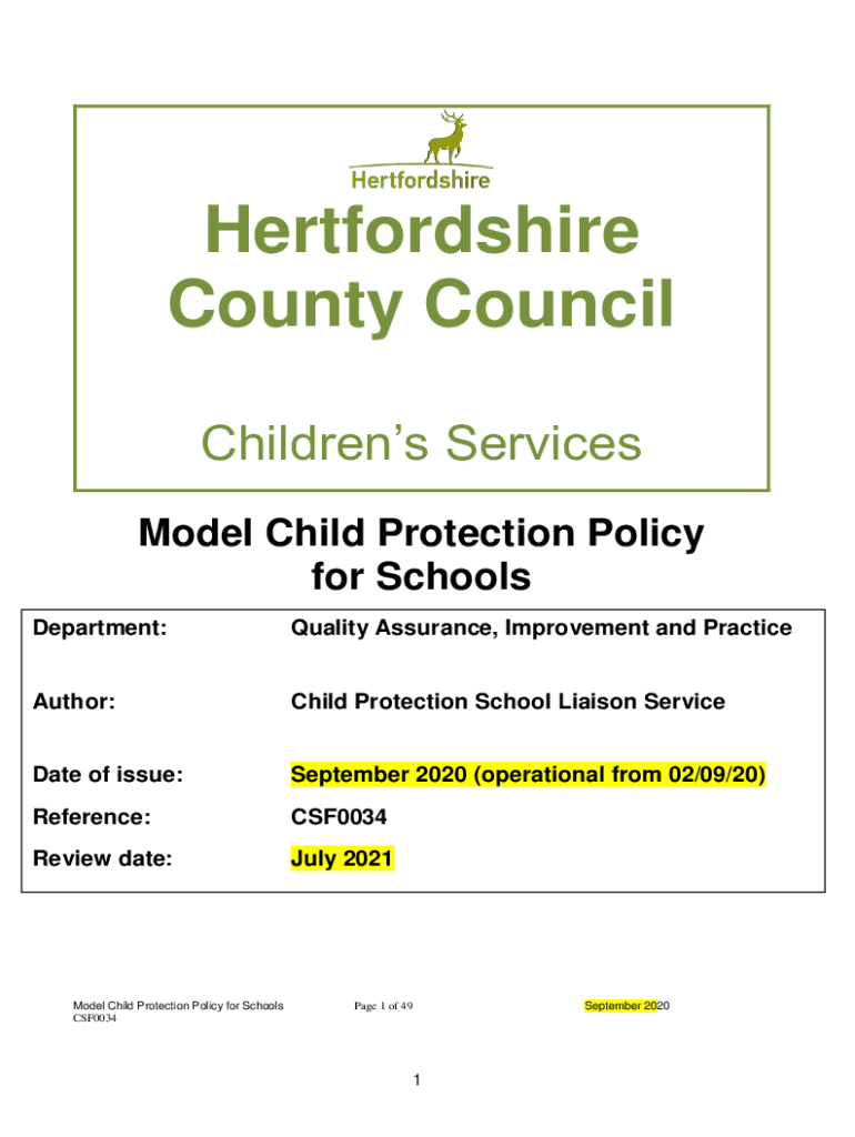 Hertfordshire County Council Children's Services Model Child Protection Policy for Schools Department:Quality Assurance, Improvement and PracticeAuthor:Child Protection School Liaison Service Date