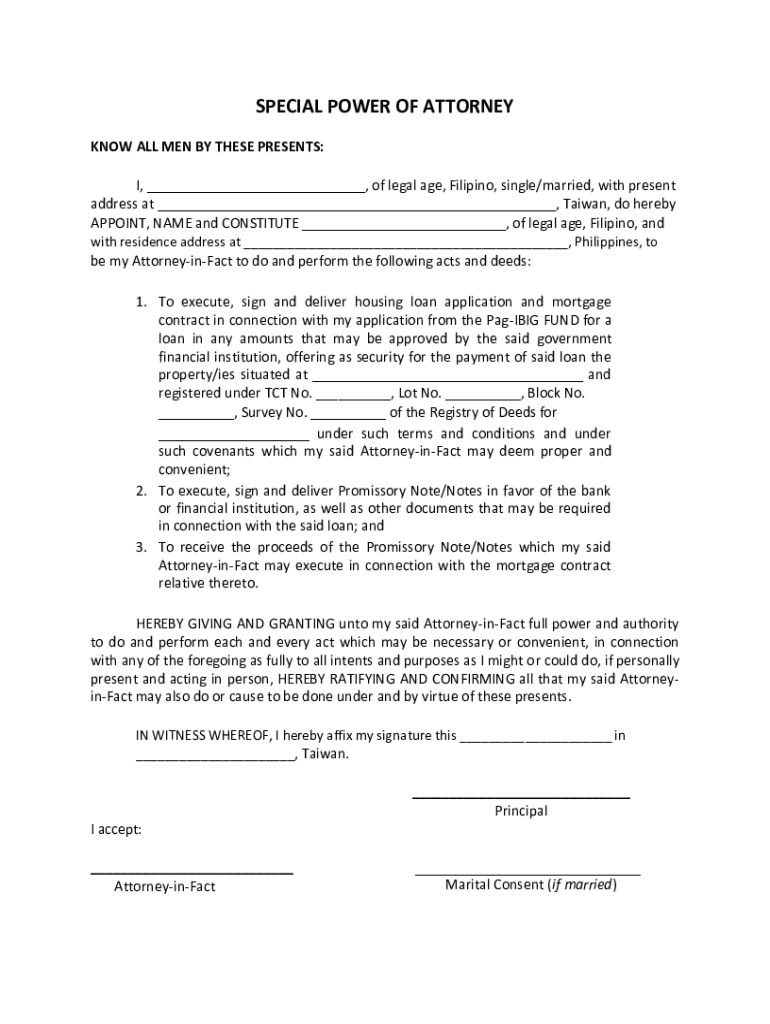 SPECIAL POWER OF ATTORNEY KNOW ALL MEN BY THESE PRESENTS: I, ___, of legal age, Filipino, single/married, with present address at ___, Taiwan, do hereby APPOINT, NAME and CONSTITUTE ___, of legal