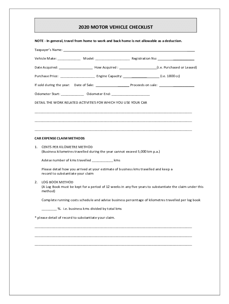 2020 MOTOR VEHICLE CHECKLIST NOTE In general, travel from home to work and back home is not allowable as a deduction. Taxpayers Name:___Vehicle Make: ___ Model: ___ Registration No: Date Acquired:How