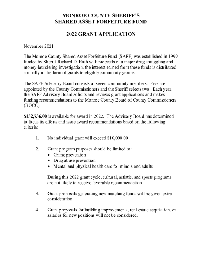 MONROE COUNTY SHERIFFS SHARED ASSET FORFEITURE FUND 2022 GRANT APPLICATION November 2021 The Monroe County Shared Asset Forfeiture Fund (STAFF) was established in 1999 funded by Sheriff Richard D.