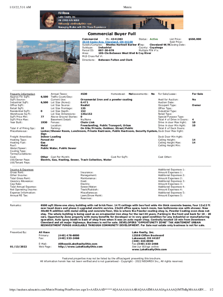 1/13/22, 5:31 AMMatrixCommercial Buyer Full Commercial ML: 4341363 Status: Active List Price: 3519 Desk Ave, Cleveland, OH 44109 Sold Price: Subdiv/Complex: Rhodes Hartnell Barber Twp: Cleveland/Closing
