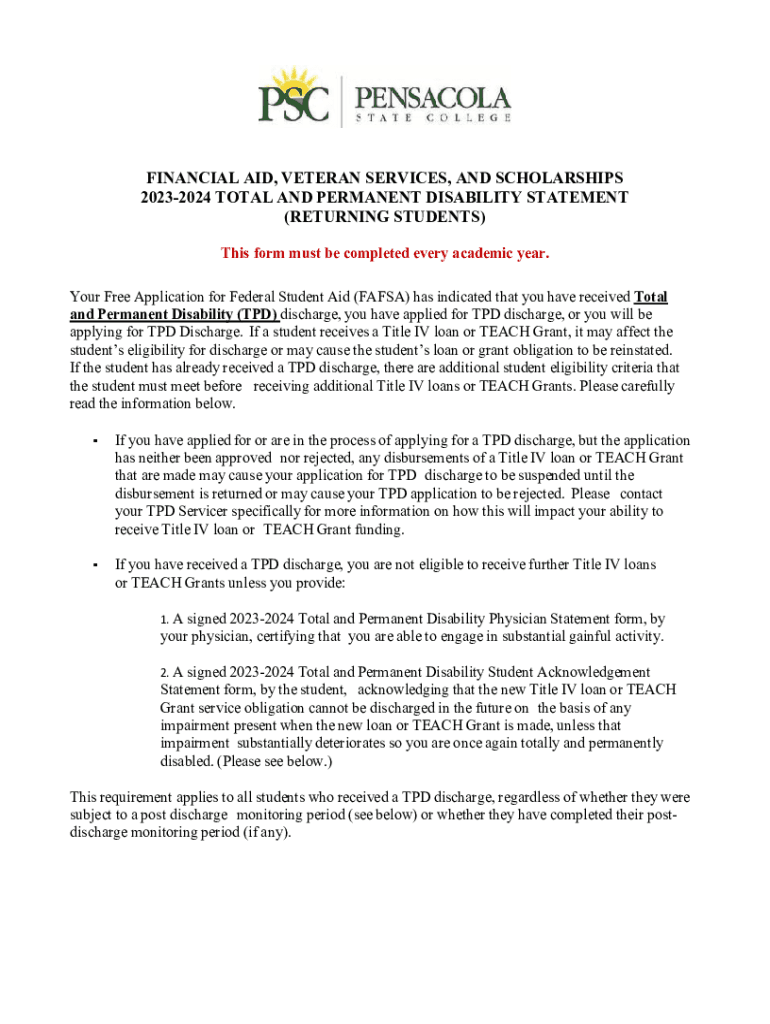 FINANCIAL AID, VETERAN SERVICES, AND SCHOLARSHIPS 20232024 TOTAL AND PERMANENT DISABILITY STATEMENT (RETURNING STUDENTS) This form must be completed every academic year. Your Free Application for