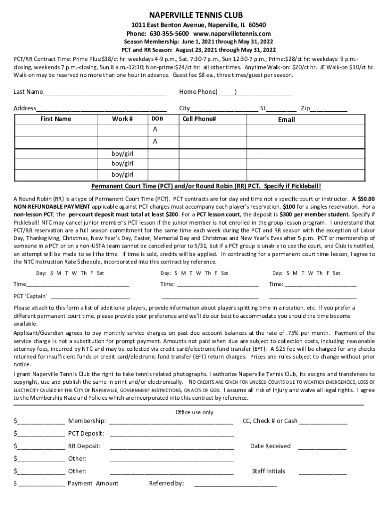 NAPERVILLE TENNIS CLUB 1011 East Benton Avenue, Naperville, IL 60540 Phone: 6303555600 www.napervilletennis.com Season Membership: June 1, 2021, through May 31, 2023, PCT and RR Season: August 23,