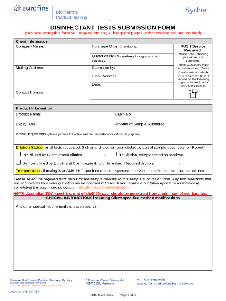 The DISINFECTANT TESTS SUBMISSION Client ... is a fillable form in MS Word extension required to be submitted to the relevant address in order to provide certain info. It has to be filled-out and signed, which is possible manually, or with the help of a particular software such as PDFfiller. This tool allows to fill out any PDF or Word document directly in your browser, customize it depending on your purposes and put a legally-binding e-signature. Once after completion, the user can send the DISINFECTANT TESTS SUBMISSION Client ... to the appropriate person, or multiple recipients via email or fax. The template is printable too because of PDFfiller feature and options offered for printing out adjustment. In both digital and physical appearance, your form will have got organized and professional look. You can also turn it into a template to use it later, there's no need to create a new file over and over. All you need to do is to amend the ready document.
