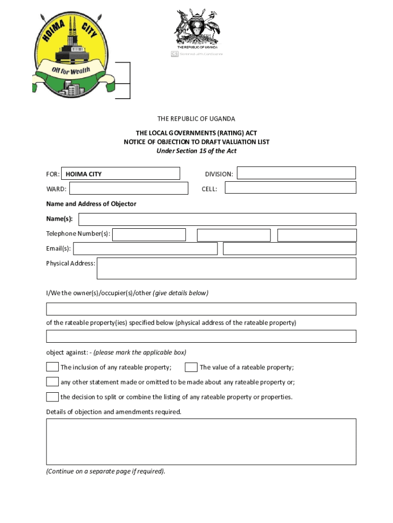FORM RF2 Regulation 11 REF:THE REPUBLIC OF UGANDA THE LOCAL GOVERNMENTS (RATING) ACT NOTICE OF OBJECTION TO DRAFT VALUATION LIST Under Section 15 of the Act FOR:DIVISION:WARD:CELL:Name and Address
