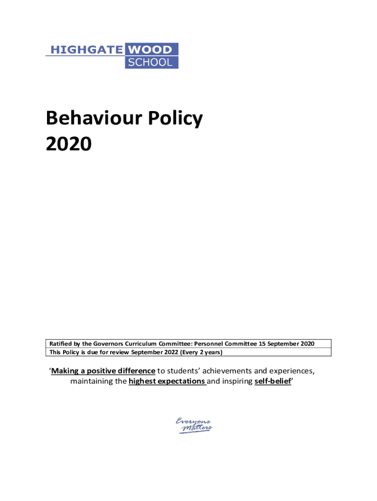 Behavior Policy 2020Ratified by the Governors Curriculum Committee: Personnel Committee 15 September 2020 This Policy is due for review September 2022 (Every 2 years)Making a positive difference to