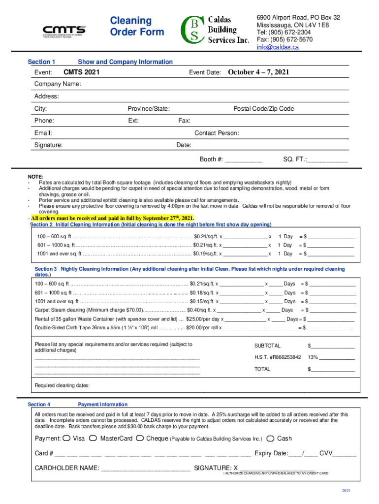 6900 Airport Road, PO Box 32 Mississauga, ON L4V 1E8 Tel: (905) 6722304 Fax: (905) 6725670 info@caldas.caCleaning Order Form Section 1 Event:Show and Company InformationCMTS 2021Event Date:October