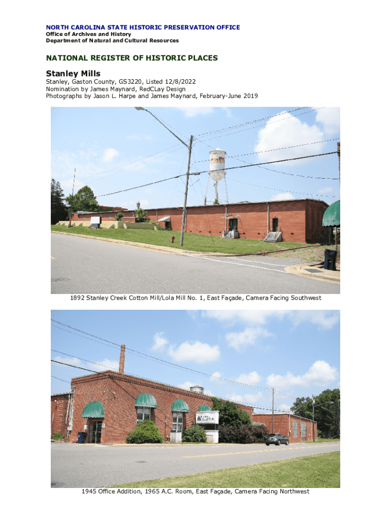NORTH CAROLINA STATE HISTORIC PRESERVATION OFFICE of Archives and History Department of Natural and Cultural ResourcesNATIONAL REGISTER OF HISTORIC PLACES Stanley Mills Stanley, Gaston County, GS3220,