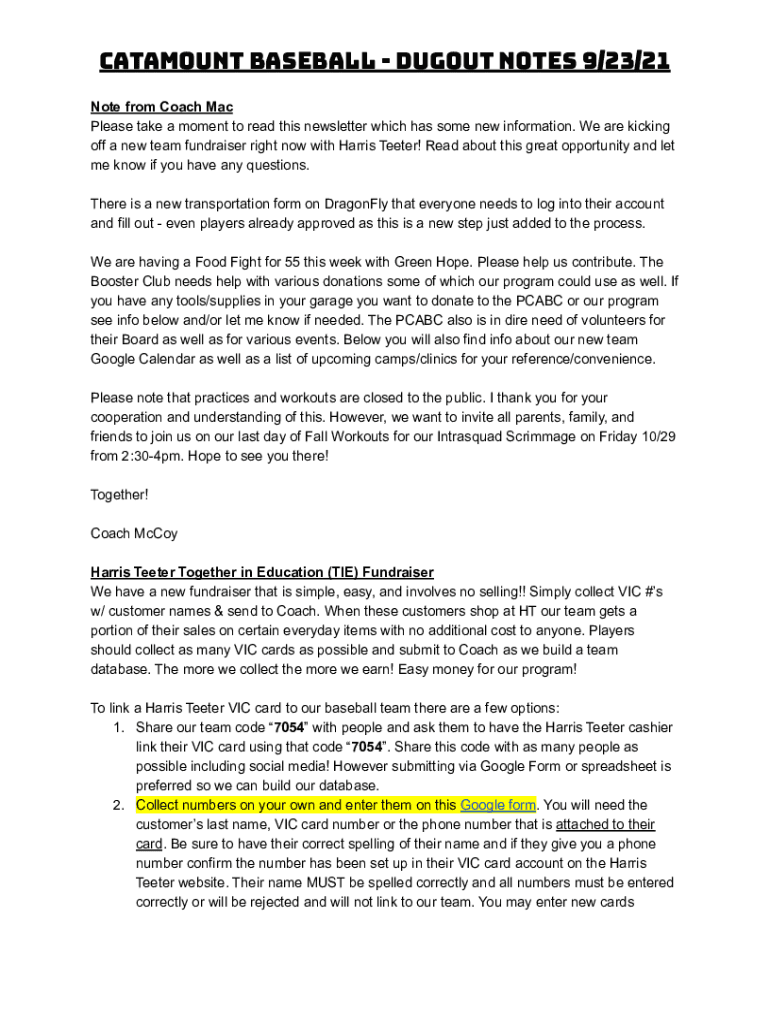 Cat amount Baseball Dugout NOTES 9/23/21 Note from Coach Mac Please take a moment to read this newsletter which has some new information. We are kicking off a new team fundraiser right now with Harris