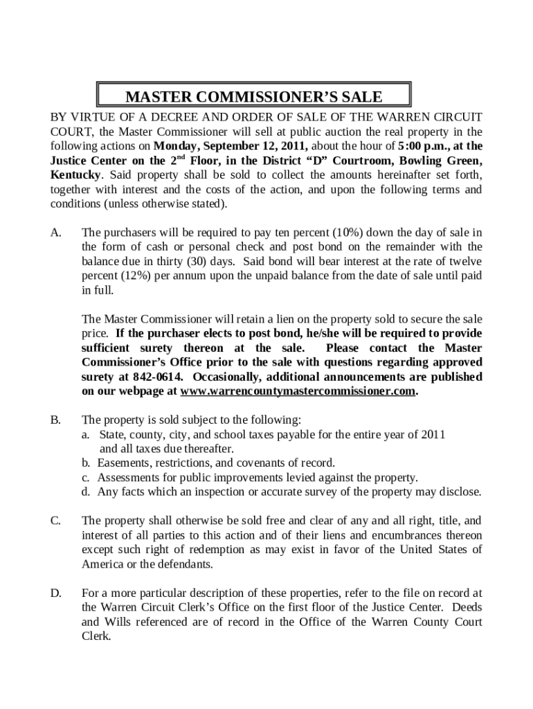 The BY VIRTUE OF A DECREE AND ORDER OF SALE OF THE ... is a Word document that should be submitted to the required address to provide certain info. It needs to be filled-out and signed, which may be done manually in hard copy, or by using a certain solution e. g. PDFfiller. This tool helps to fill out any PDF or Word document directly from your browser (no software requred), customize it depending on your requirements and put a legally-binding e-signature. Right after completion, you can easily send the BY VIRTUE OF A DECREE AND ORDER OF SALE OF THE ... to the appropriate individual, or multiple individuals via email or fax. The editable template is printable as well thanks to PDFfiller feature and options presented for printing out adjustment. In both electronic and physical appearance, your form will have a clean and professional appearance. You can also turn it into a template for later, without creating a new file from the beginning. You need just to amend the ready form.