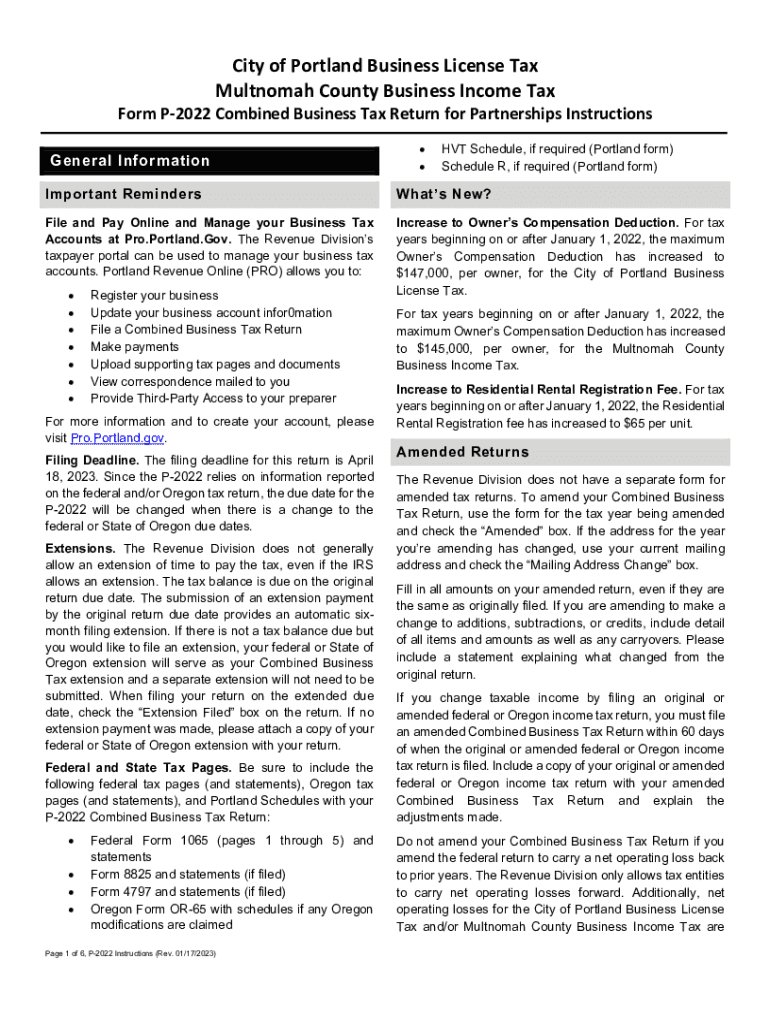 City of Portland Business License Tax Multnomah County Business Income Reinform P2022 Combined Business Tax Return for Partnerships Instructions General Information HIT Schedule, if required (Portland