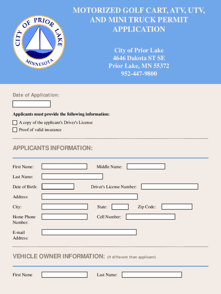 MOTORIZED GOLF CART, ATV, UTV, AND MINI TRUCK PERMIT APPLICATION City of Prior Lake 4646 Dakota ST SE Prior Lake, MN 55372 9524479800 *This form is not compatible in all web browsers. You may need