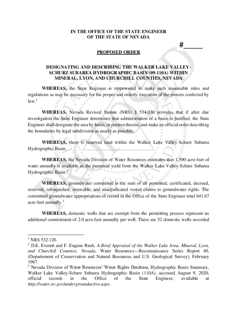 IN THE OFFICE OF THE STATE ENGINEER OF THE STATE OF NEVADA#___ PROPOSED ORDER DESIGNATING AND DESCRIBING THE WALKER LAKE VALLEYSCHURZ SUBAREA HYDROGRAPHIC BASIN (09110A) WITHIN MINERAL, LYON, AND