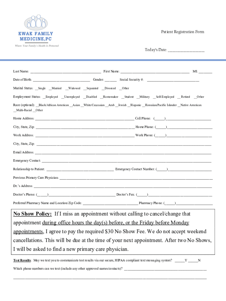 Patient Registration FormTodays Date: ___Last Name: ___ First Name: ___ MI: ___ Date of Birth: ___ Gender: ___ Social Security #: ___ Marital Status: __Single __Married __Widowed __Separated __Divorced