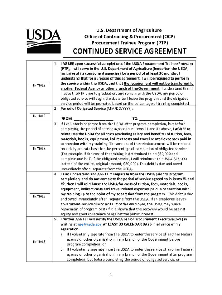 U.S. Department of Agriculture Office of Contracting & Procurement (OCP) Procurement Trainee Program (PTP)CONTINUED SERVICE AGREEMENTINITIALSINITIALSINITIALSINITIALSINITIALS1. I AGREE upon successful