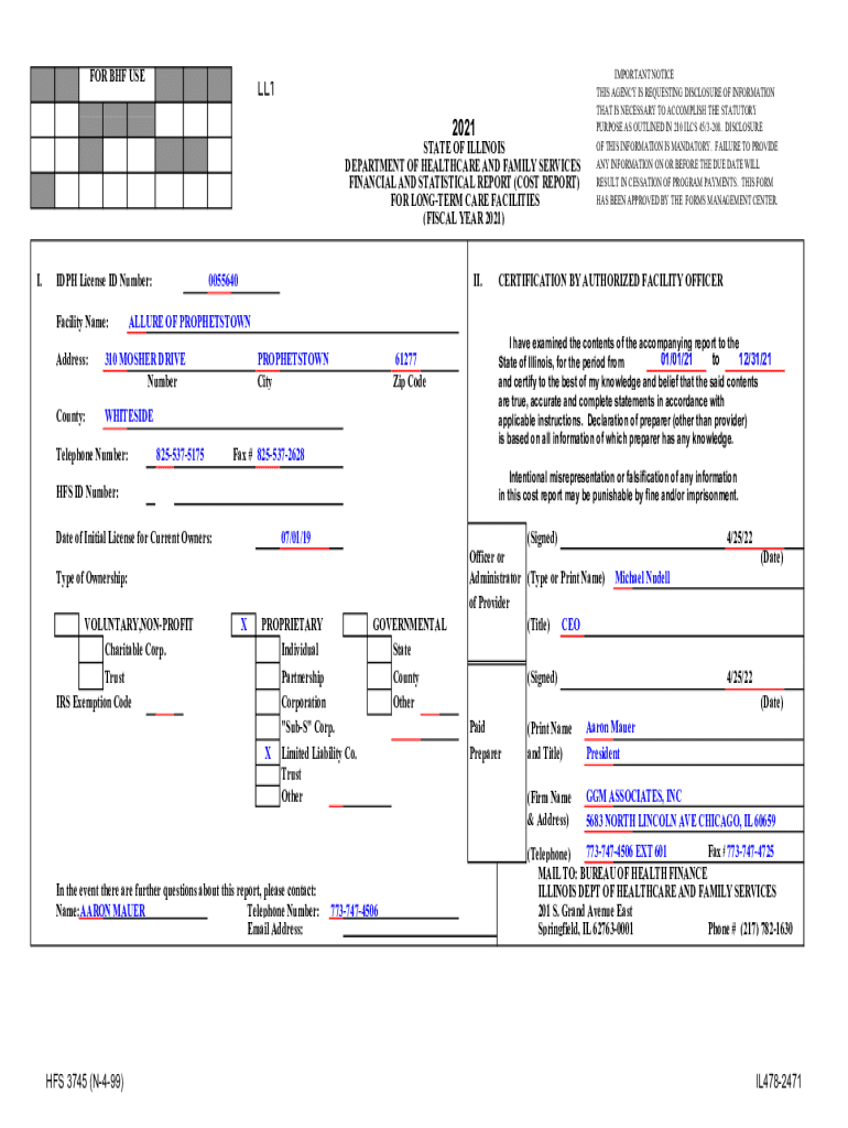 FOR BHF USELL1 2021STATE OF ILLINOIS DEPARTMENT OF HEALTHCARE AND FAMILY SERVICES FINANCIAL AND STATISTICAL REPORT (COST REPORT) FOR LONGER CARE FACILITIES (FISCAL YEAR 2021) I.DPH License ID Number: