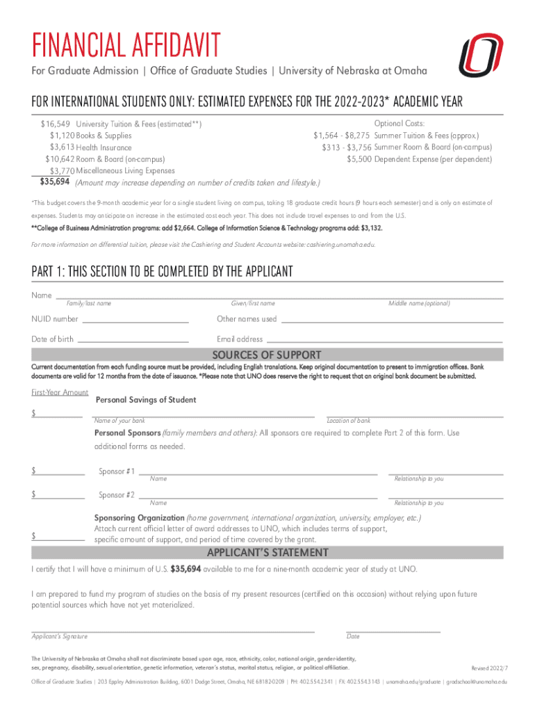 FINANCIAL Affidavit Graduate Admission | Office of Graduate Studies | University of Nebraska at Omaha INTERNATIONAL STUDENTS ONLY: ESTIMATED EXPENSES FOR THE 20222023* ACADEMIC YEAR Optional Costs: